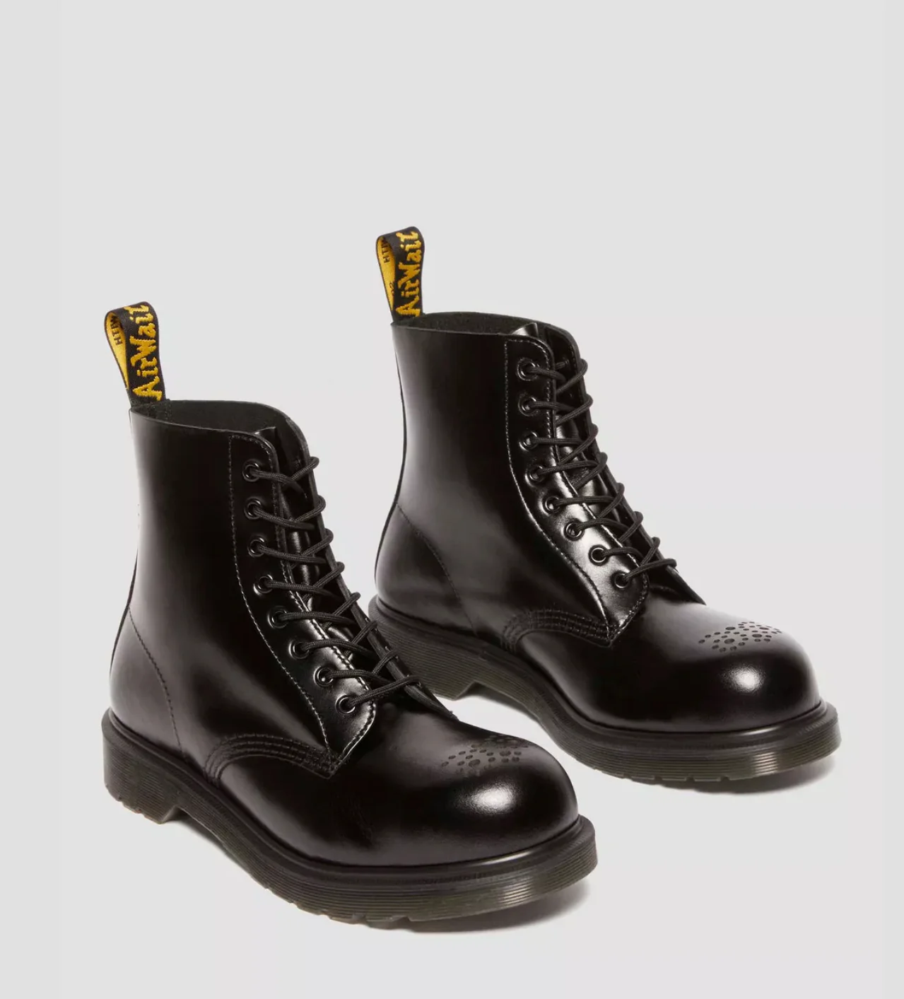 Good as Gold Store brings you exclusive UK access to this workwear-inspired all-black Dr. Martens 1460 boot. A refreshing take on a DM’s icon with exposed steel toe cap through upper toe brogue detailing. Constructed using smooth Analine leather and set on a classic DMS sole secured with a stealth plain welt. Tonal laces and hardware. Complete with the unmistakable Dr. Marten's AirWair heel loop.