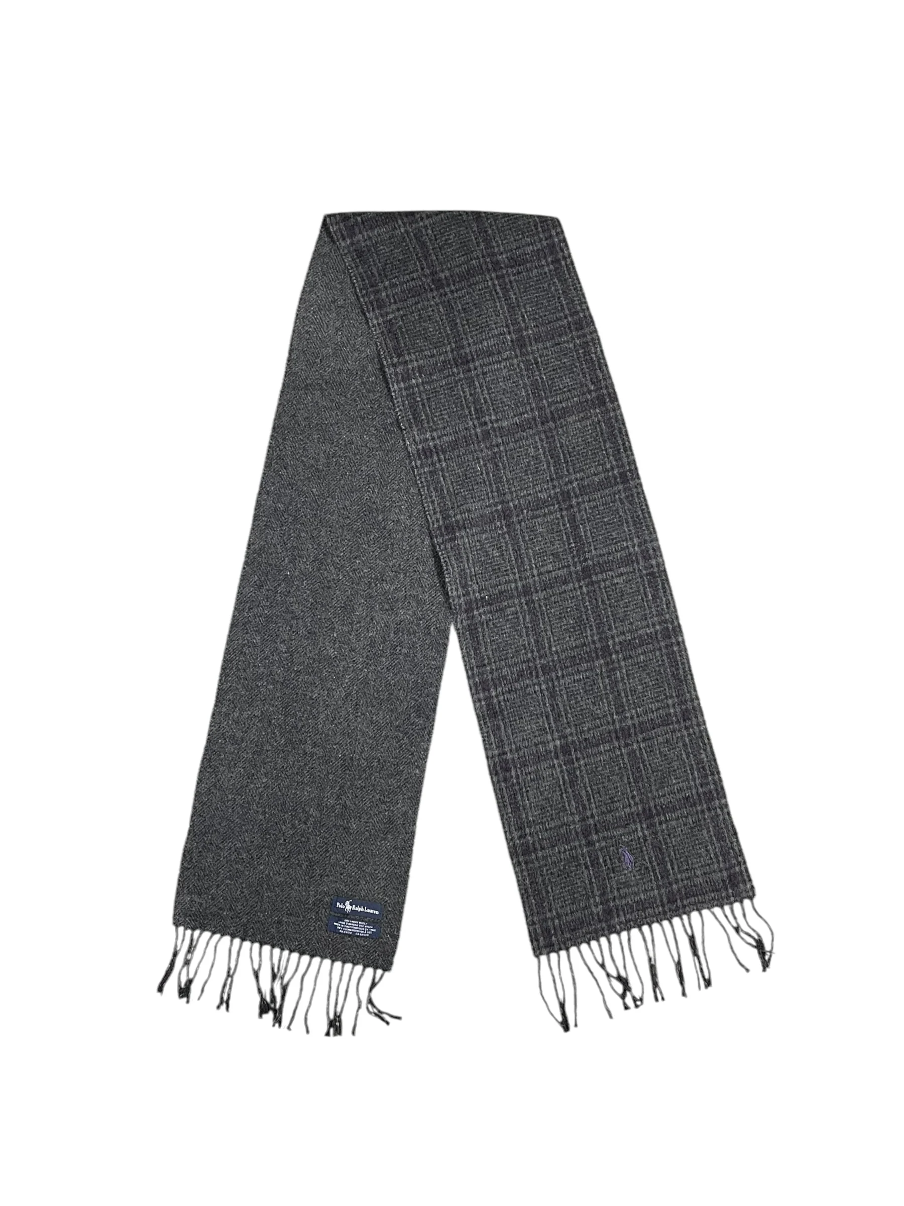 Vintage Ralph Lauren wool scarf in a grey colour way. Double sided with plaid patterning and embroidered Polo player logo.