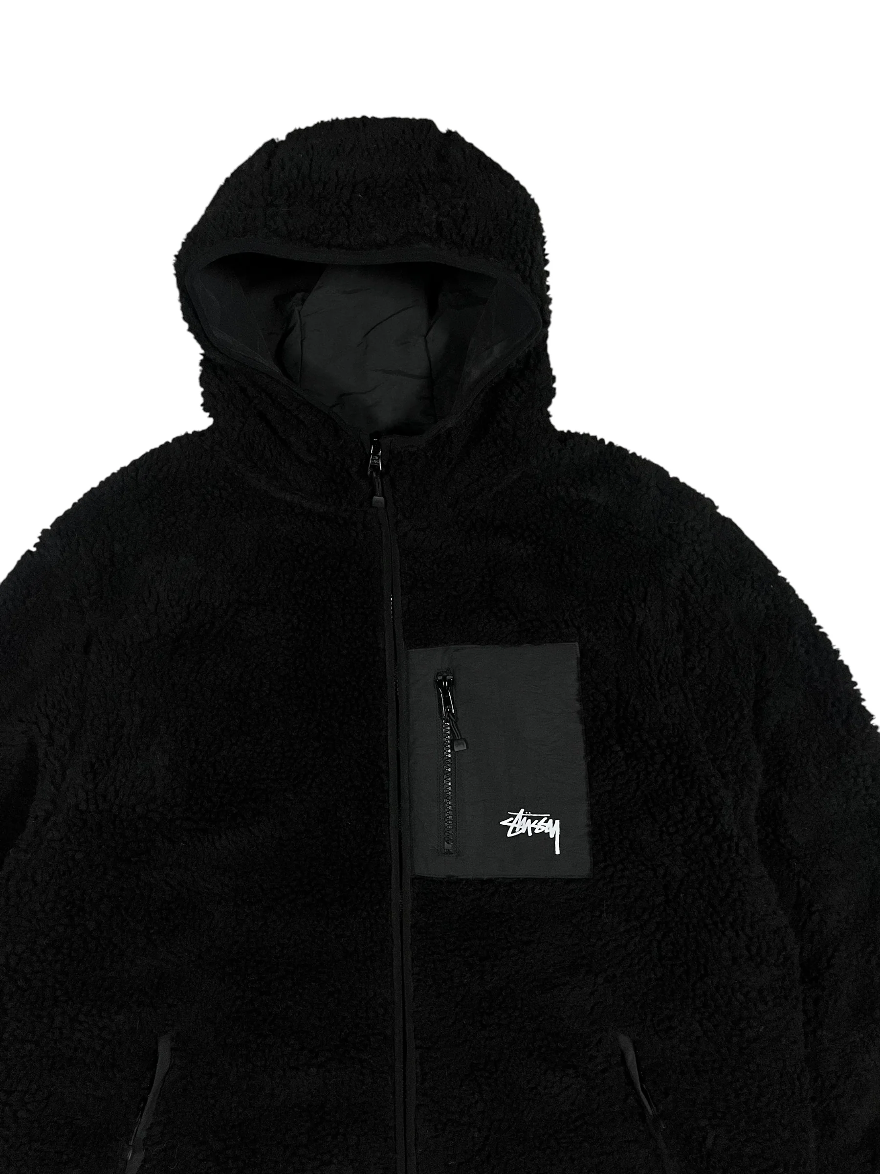 Reversible Stüssy 8 Ball Jacket. Hooded overcoat with full zip closure and printed graffiti logo graphic. Sherpa side boasts the iconic 8 ball motif to the back and side entry chest pocket. Dual front pockets to both sides and zip closure. Available in both black and beige colour way. True to size.