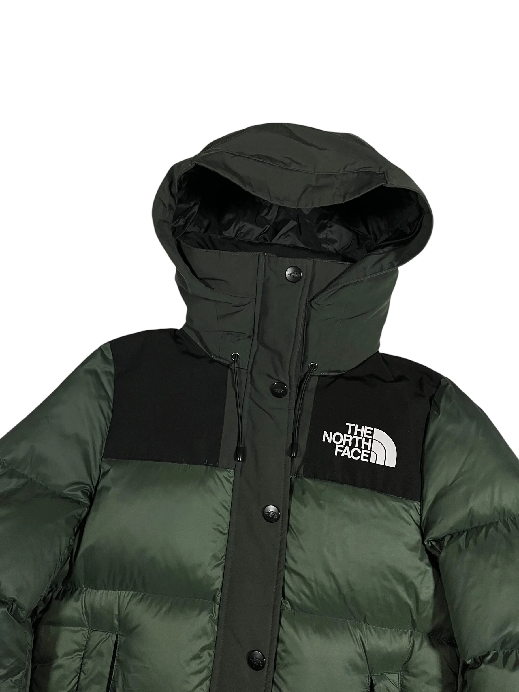 Rare TNF x Sacai collaboration Nuptse jacket in khaki green and black. Hood can be packed down into the collar forming a tall stand up collar. Duck down insulated. Very good condition.